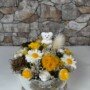 Uma explosão de luz e otimismo. Margaridas brancas e flores amarelas vibrantes convivem harmoniosamente com um pequeno urso polar decorativo.