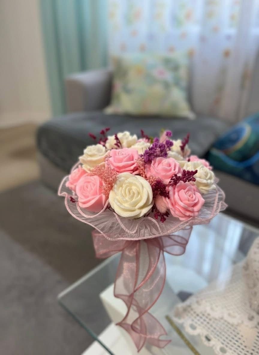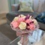 Composto por rosas artesanais em tons suaves de rosa pastel e creme, intercaladas com pequenos apontamentos de flores secas roxas.