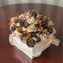 Inspirada nas cores do pôr-do-sol, esta composição mistura rosas de um castanho profundo com flores em tons de laranja e ocre.