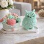 Esta composição refrescante destaca-se pela coruja em tom verde menta, acompanhada por um arranjo de flores em tons pastel.